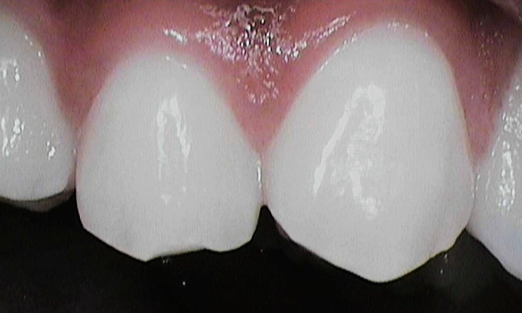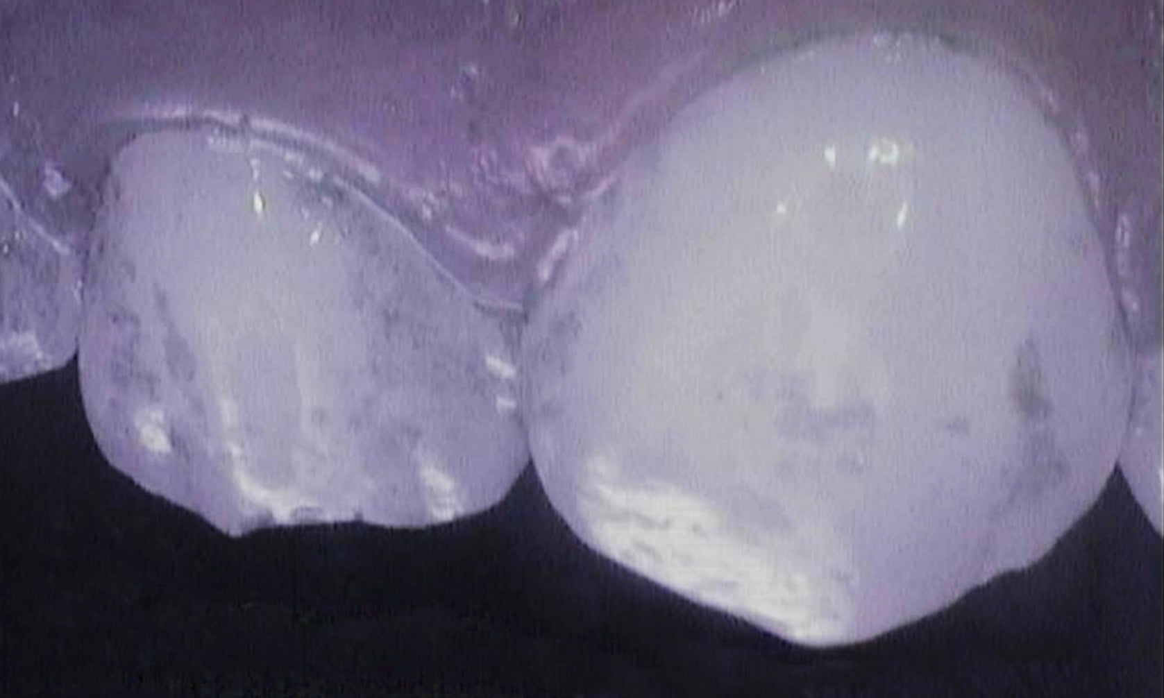 After traditional brushing, the teeth may look clean to the naked eye (left). However, near-infrared light reveals that plenty of plaque remains on the teeth.